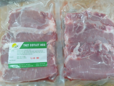 Quy cách đóng gói: túi 500gr - 600gr gồm 5 miếng sườn cốt lết cắt sẵn, hút chân không.